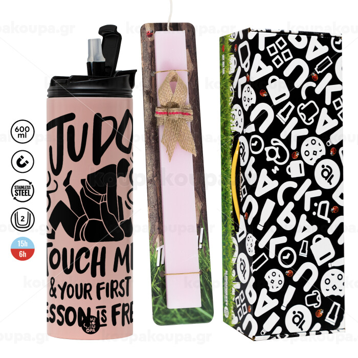 Judo Touch Me And Your First Lesson Is Free, Πασχαλινή Λαμπάδα με ΡΟΖ Travel Tumbler θερμό (600ml, BPA free) & κερί αρωματικό πλακέ (30cm) (ΡΟΖ)