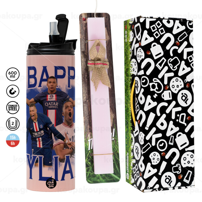 Kylian mbappe, Πασχαλινή Λαμπάδα με ΡΟΖ Travel Tumbler θερμό (600ml, BPA free) & κερί αρωματικό πλακέ (30cm) (ΡΟΖ)
