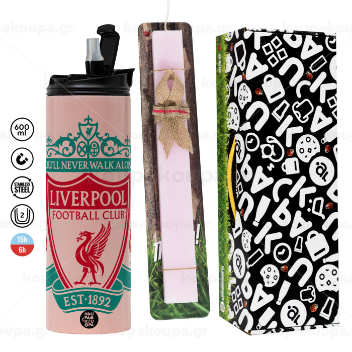 Liverpool, Πασχαλινή Λαμπάδα με ΡΟΖ Travel Tumbler θερμό (600ml, BPA free) & κερί αρωματικό πλακέ (30cm) (ΡΟΖ)