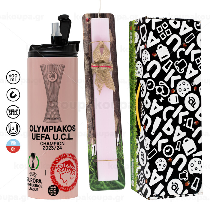 Ολυμπιακός νικητής UEFA Europa Conference League Champion 2023/24, Πασχαλινή Λαμπάδα με ΡΟΖ Travel Tumbler θερμό (600ml, BPA free) & κερί αρωματικό πλακέ (30cm) (ΡΟΖ)