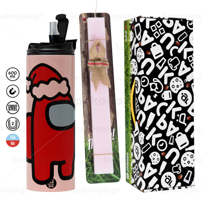 Among US Santa, Πασχαλινή Λαμπάδα με ΡΟΖ Travel Tumbler θερμό (600ml, BPA free) & κερί αρωματικό πλακέ (30cm) (ΡΟΖ)