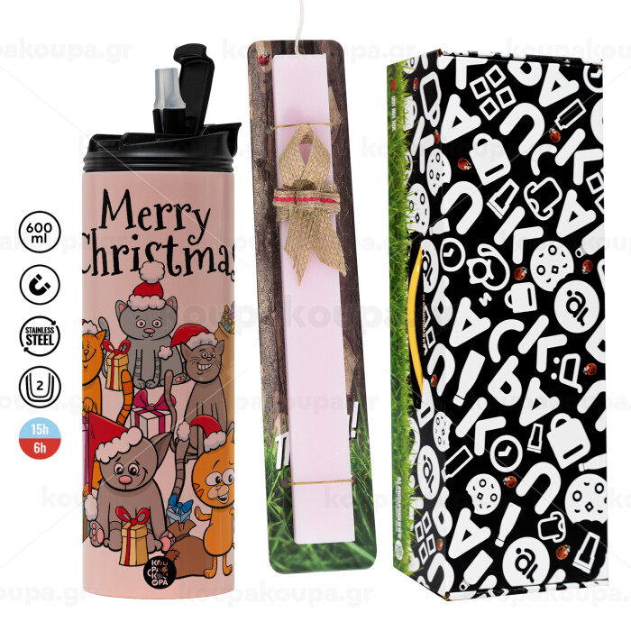 Merry Christmas Cats, Πασχαλινή Λαμπάδα με ΡΟΖ Travel Tumbler θερμό (600ml, BPA free) & κερί αρωματικό πλακέ (30cm) (ΡΟΖ)
