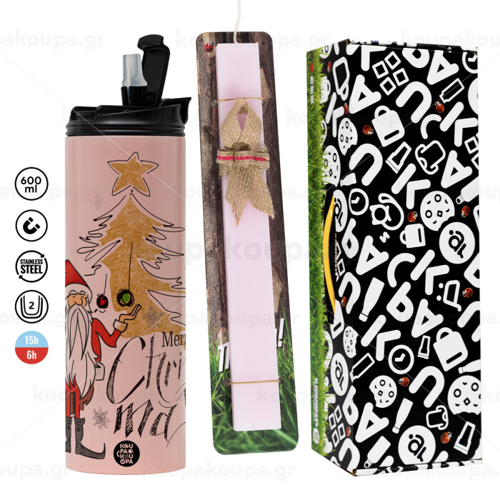 Santa Claus gold, Πασχαλινή Λαμπάδα με ΡΟΖ Travel Tumbler θερμό (600ml, BPA free) & κερί αρωματικό πλακέ (30cm) (ΡΟΖ)