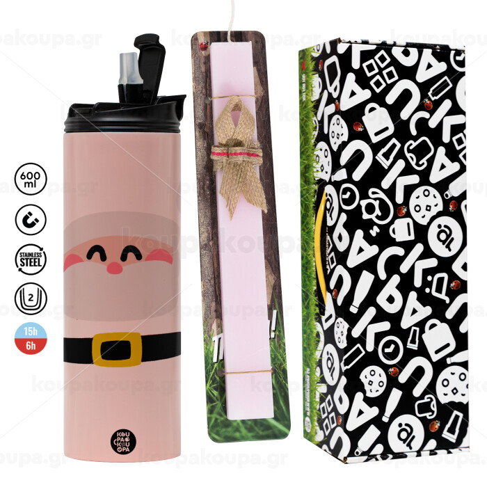 Simple Santa, Πασχαλινή Λαμπάδα με ΡΟΖ Travel Tumbler θερμό (600ml, BPA free) & κερί αρωματικό πλακέ (30cm) (ΡΟΖ)