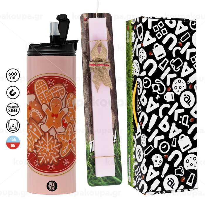xmas cookies, Πασχαλινή Λαμπάδα με ΡΟΖ Travel Tumbler θερμό (600ml, BPA free) & κερί αρωματικό πλακέ (30cm) (ΡΟΖ)