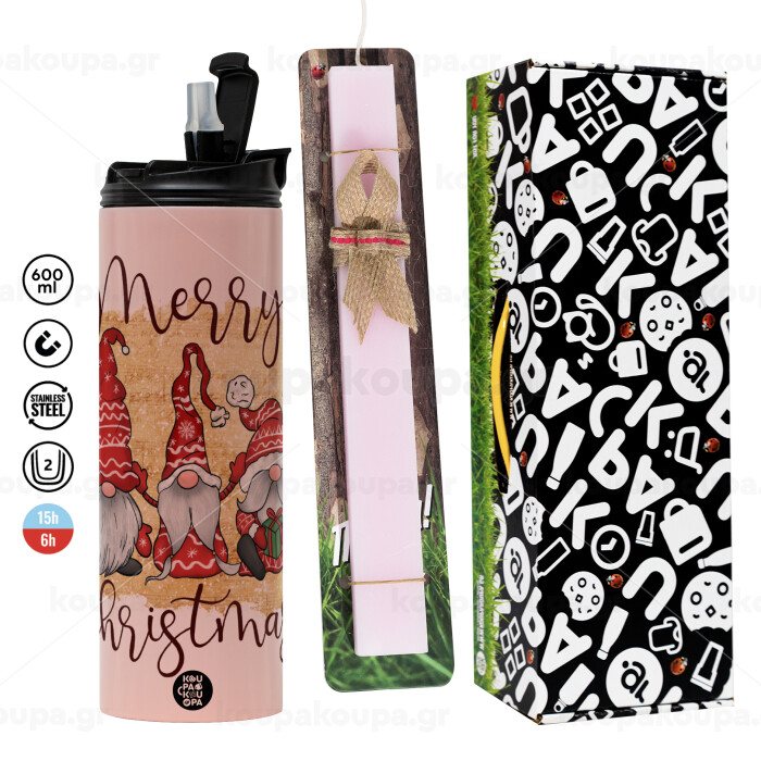 Xmas Elves, Πασχαλινή Λαμπάδα με ΡΟΖ Travel Tumbler θερμό (600ml, BPA free) & κερί αρωματικό πλακέ (30cm) (ΡΟΖ)