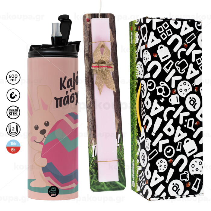 Καλό πάσχα, Πασχαλινή Λαμπάδα με ΡΟΖ Travel Tumbler θερμό (600ml, BPA free) & κερί αρωματικό πλακέ (30cm) (ΡΟΖ)