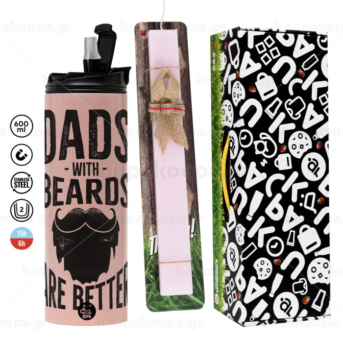 Dad's with beards are better, Πασχαλινή Λαμπάδα με ΡΟΖ Travel Tumbler θερμό (600ml, BPA free) & κερί αρωματικό πλακέ (30cm) (ΡΟΖ)