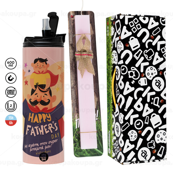 Happy Fathers Day με όνομα, Πασχαλινή Λαμπάδα με ΡΟΖ Travel Tumbler θερμό (600ml, BPA free) & κερί αρωματικό πλακέ (30cm) (ΡΟΖ)