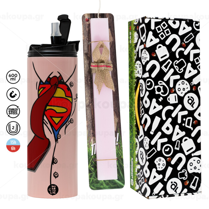 SuperDad, Πασχαλινή Λαμπάδα με ΡΟΖ Travel Tumbler θερμό (600ml, BPA free) & κερί αρωματικό πλακέ (30cm) (ΡΟΖ)