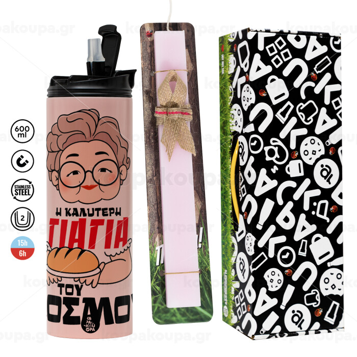 Η καλύτερη γιαγιά του κόσμου!, Πασχαλινή Λαμπάδα με ΡΟΖ Travel Tumbler θερμό (600ml, BPA free) & κερί αρωματικό πλακέ (30cm) (ΡΟΖ)