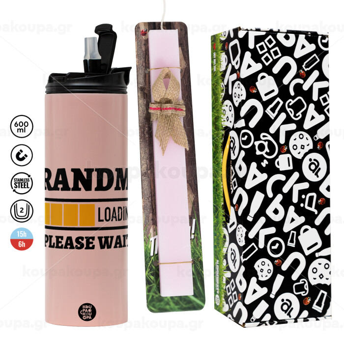 Grandma Loading, Πασχαλινή Λαμπάδα με ΡΟΖ Travel Tumbler θερμό (600ml, BPA free) & κερί αρωματικό πλακέ (30cm) (ΡΟΖ)