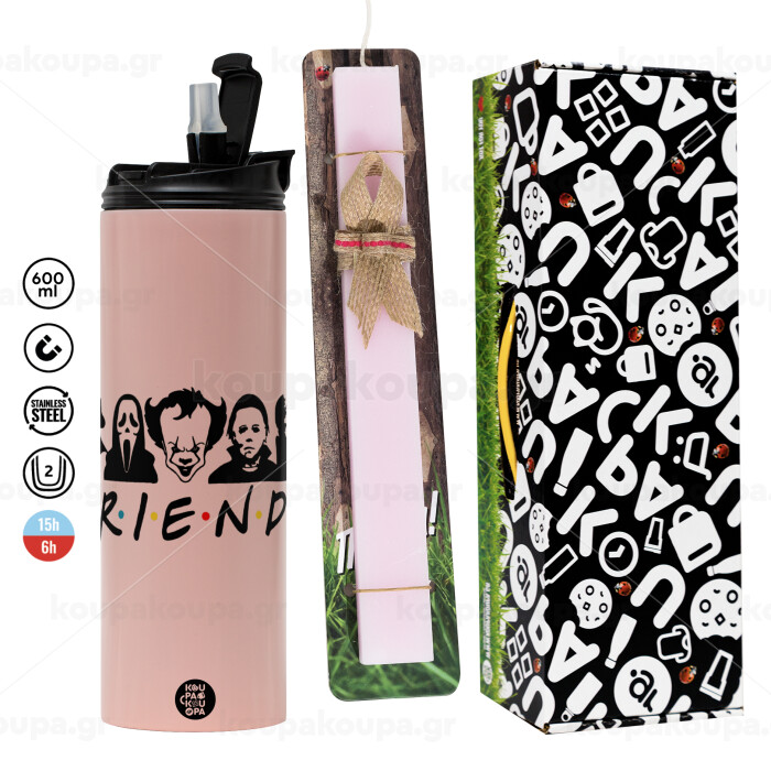 Halloween Friends, Πασχαλινή Λαμπάδα με ΡΟΖ Travel Tumbler θερμό (600ml, BPA free) & κερί αρωματικό πλακέ (30cm) (ΡΟΖ)