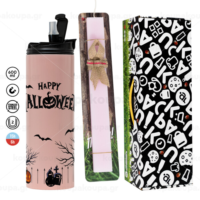 Happy Halloween cemetery, Πασχαλινή Λαμπάδα με ΡΟΖ Travel Tumbler θερμό (600ml, BPA free) & κερί αρωματικό πλακέ (30cm) (ΡΟΖ)