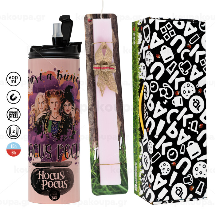 Hocus Pocus, Πασχαλινή Λαμπάδα με ΡΟΖ Travel Tumbler θερμό (600ml, BPA free) & κερί αρωματικό πλακέ (30cm) (ΡΟΖ)
