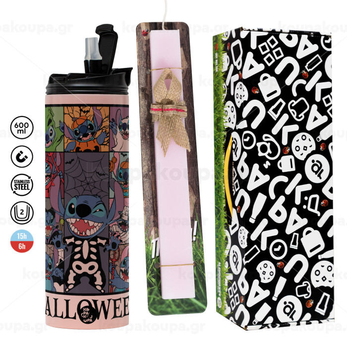Stitch Halloween, Πασχαλινή Λαμπάδα με ΡΟΖ Travel Tumbler θερμό (600ml, BPA free) & κερί αρωματικό πλακέ (30cm) (ΡΟΖ)