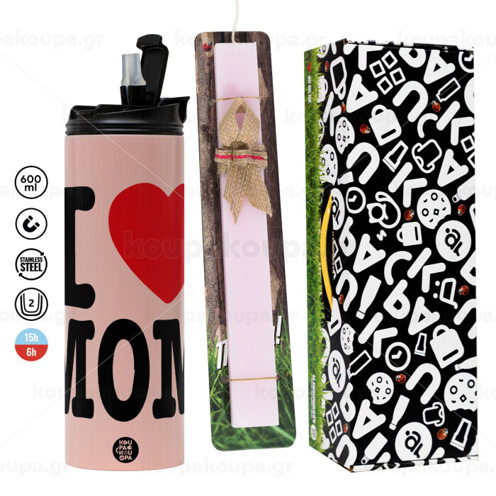 I LOVE MOM, Πασχαλινή Λαμπάδα με ΡΟΖ Travel Tumbler θερμό (600ml, BPA free) & κερί αρωματικό πλακέ (30cm) (ΡΟΖ)