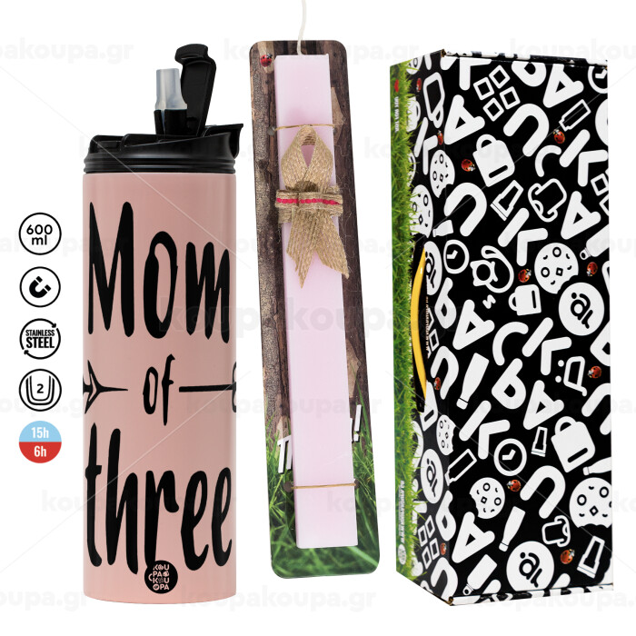 Mom of three, Πασχαλινή Λαμπάδα με ΡΟΖ Travel Tumbler θερμό (600ml, BPA free) & κερί αρωματικό πλακέ (30cm) (ΡΟΖ)