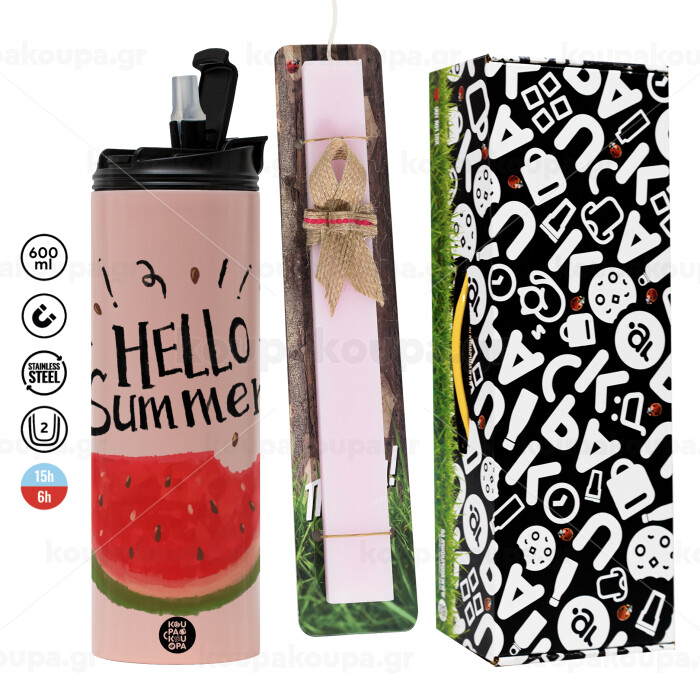 Summer Watermelon, Πασχαλινή Λαμπάδα με ΡΟΖ Travel Tumbler θερμό (600ml, BPA free) & κερί αρωματικό πλακέ (30cm) (ΡΟΖ)