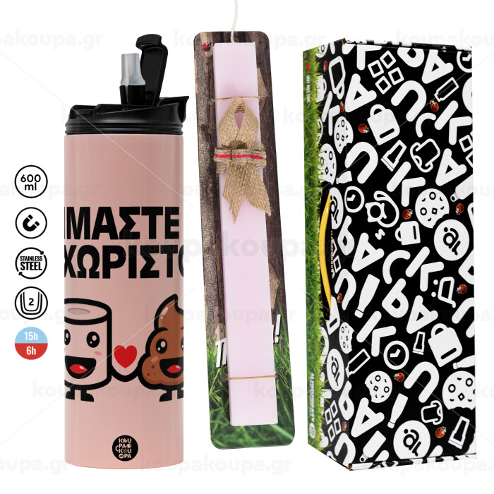 Είμαστε αχώριστοι, Πασχαλινή Λαμπάδα με ΡΟΖ Travel Tumbler θερμό (600ml, BPA free) & κερί αρωματικό πλακέ (30cm) (ΡΟΖ)