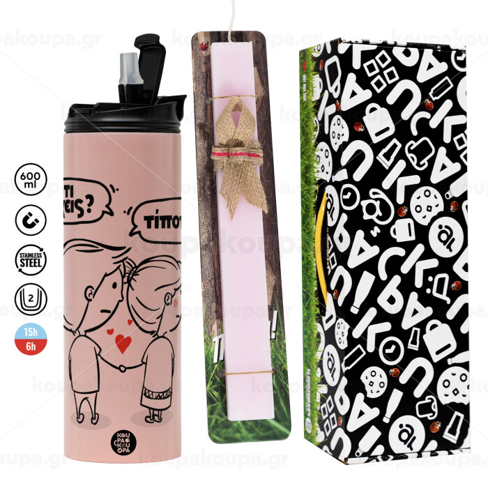 Τι έχεις? Τίποτα!, Πασχαλινή Λαμπάδα με ΡΟΖ Travel Tumbler θερμό (600ml, BPA free) & κερί αρωματικό πλακέ (30cm) (ΡΟΖ)