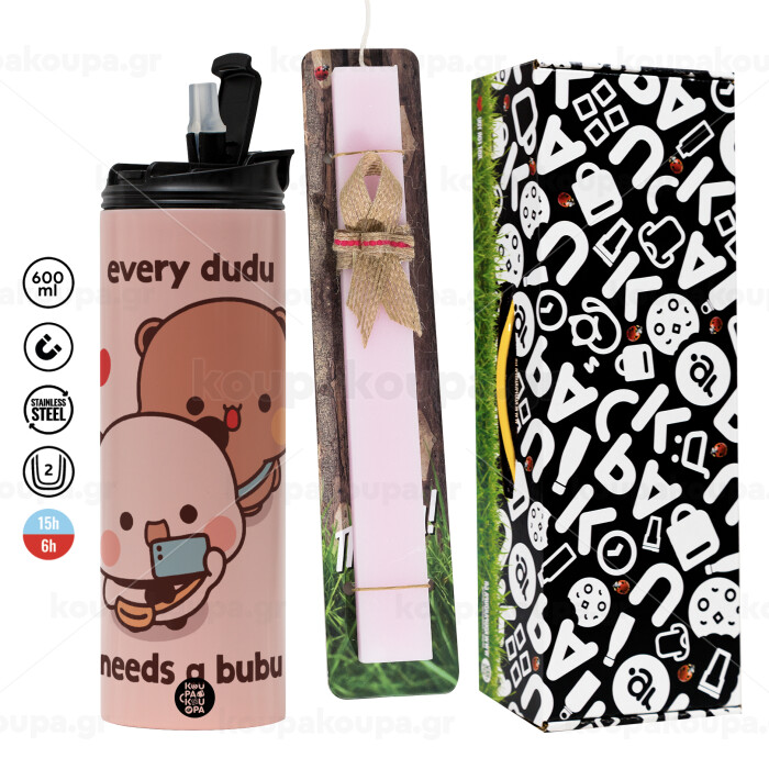 Every Dudu needs a bubu, Πασχαλινή Λαμπάδα με ΡΟΖ Travel Tumbler θερμό (600ml, BPA free) & κερί αρωματικό πλακέ (30cm) (ΡΟΖ)
