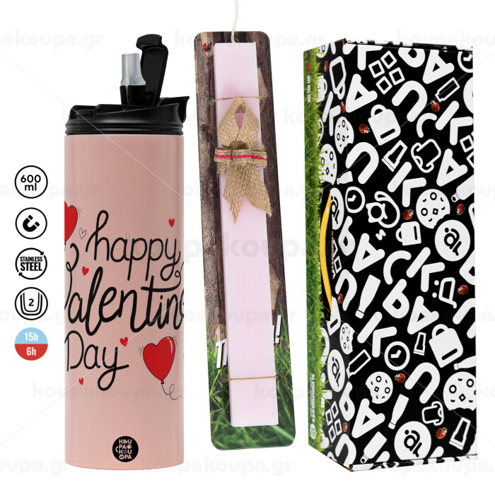 Happy Valentines Day!!!, Πασχαλινή Λαμπάδα με ΡΟΖ Travel Tumbler θερμό (600ml, BPA free) & κερί αρωματικό πλακέ (30cm) (ΡΟΖ)