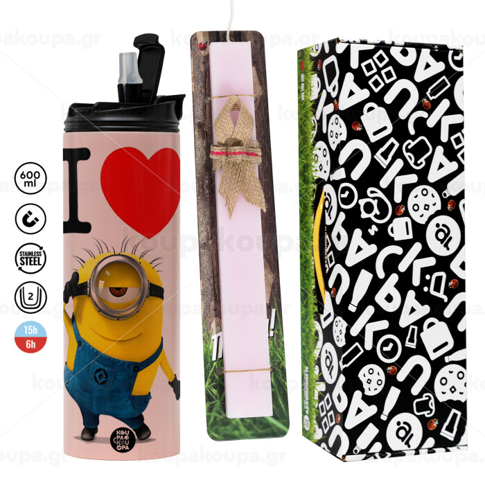 I love by minion, Πασχαλινή Λαμπάδα με ΡΟΖ Travel Tumbler θερμό (600ml, BPA free) & κερί αρωματικό πλακέ (30cm) (ΡΟΖ)