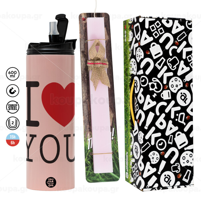 I Love you classic, Πασχαλινή Λαμπάδα με ΡΟΖ Travel Tumbler θερμό (600ml, BPA free) & κερί αρωματικό πλακέ (30cm) (ΡΟΖ)