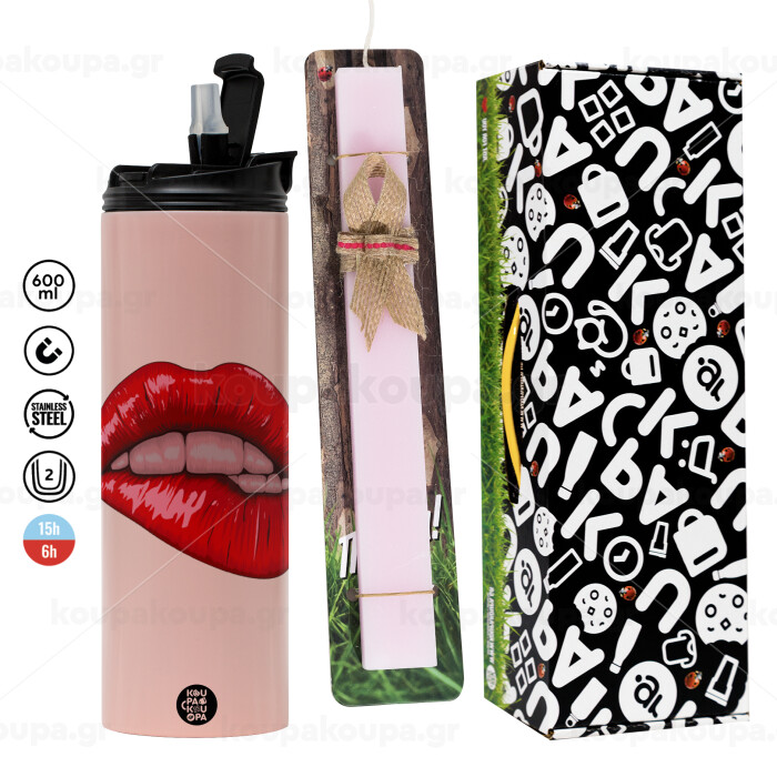 Lips, Πασχαλινή Λαμπάδα με ΡΟΖ Travel Tumbler θερμό (600ml, BPA free) & κερί αρωματικό πλακέ (30cm) (ΡΟΖ)