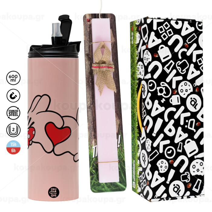 Love hands, Πασχαλινή Λαμπάδα με ΡΟΖ Travel Tumbler θερμό (600ml, BPA free) & κερί αρωματικό πλακέ (30cm) (ΡΟΖ)