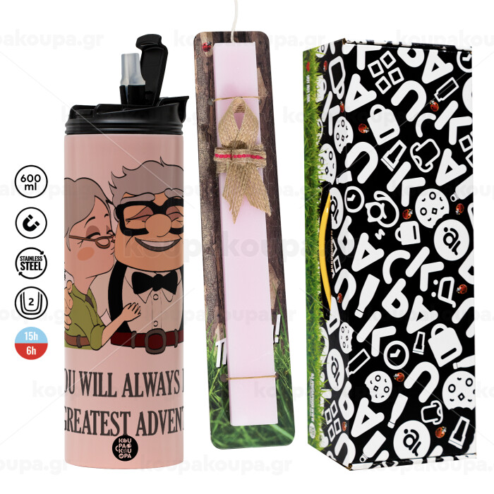 UP, YOU WILL ALWAYS BE MY GREATEST ADVENTURE, Πασχαλινή Λαμπάδα με ΡΟΖ Travel Tumbler θερμό (600ml, BPA free) & κερί αρωματικό πλακέ (30cm) (ΡΟΖ)