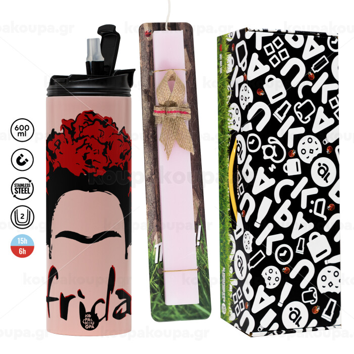 Frida, Πασχαλινή Λαμπάδα με ΡΟΖ Travel Tumbler θερμό (600ml, BPA free) & κερί αρωματικό πλακέ (30cm) (ΡΟΖ)
