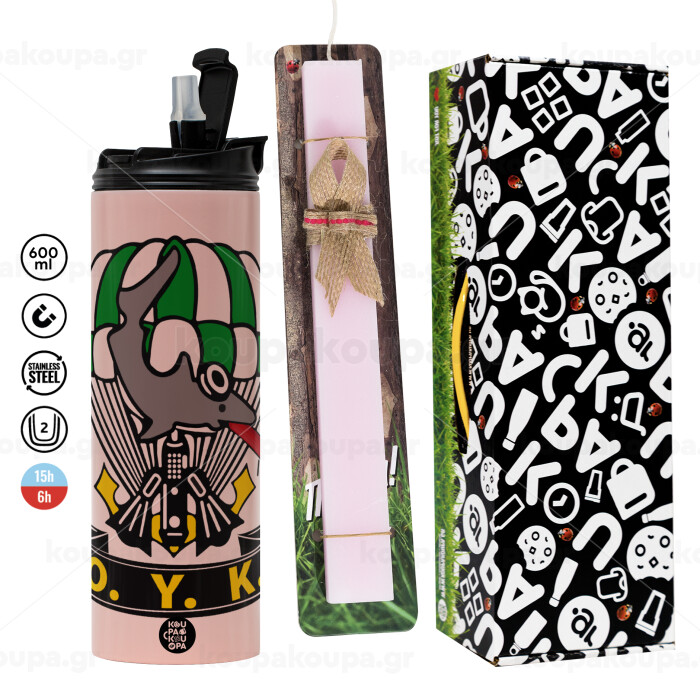 Ο.Υ.Κ., Πασχαλινή Λαμπάδα με ΡΟΖ Travel Tumbler θερμό (600ml, BPA free) & κερί αρωματικό πλακέ (30cm) (ΡΟΖ)