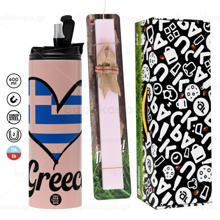 Greece flag, Πασχαλινή Λαμπάδα με ΡΟΖ Travel Tumbler θερμό (600ml, BPA free) & κερί αρωματικό πλακέ (30cm) (ΡΟΖ)