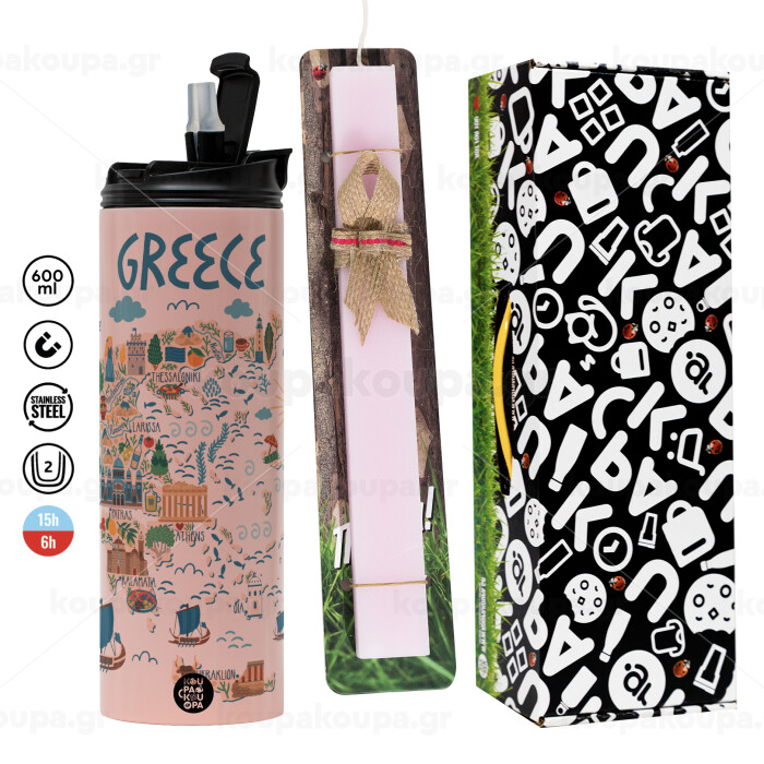 Χάρτης Ελλάδος, Πασχαλινή Λαμπάδα με ΡΟΖ Travel Tumbler θερμό (600ml, BPA free) & κερί αρωματικό πλακέ (30cm) (ΡΟΖ)
