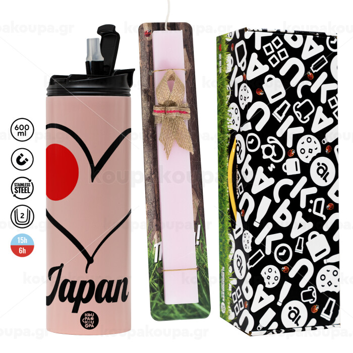 Japan flag, Πασχαλινή Λαμπάδα με ΡΟΖ Travel Tumbler θερμό (600ml, BPA free) & κερί αρωματικό πλακέ (30cm) (ΡΟΖ)