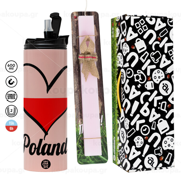 Poland flag, Πασχαλινή Λαμπάδα με ΡΟΖ Travel Tumbler θερμό (600ml, BPA free) & κερί αρωματικό πλακέ (30cm) (ΡΟΖ)