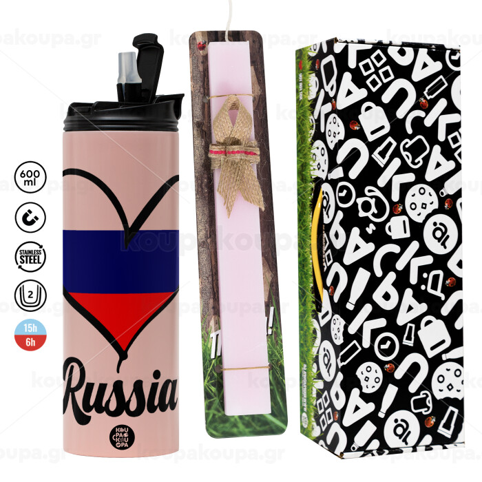 Russia flag, Πασχαλινή Λαμπάδα με ΡΟΖ Travel Tumbler θερμό (600ml, BPA free) & κερί αρωματικό πλακέ (30cm) (ΡΟΖ)