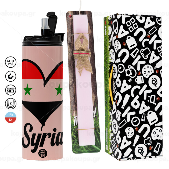 Syria flag, Πασχαλινή Λαμπάδα με ΡΟΖ Travel Tumbler θερμό (600ml, BPA free) & κερί αρωματικό πλακέ (30cm) (ΡΟΖ)