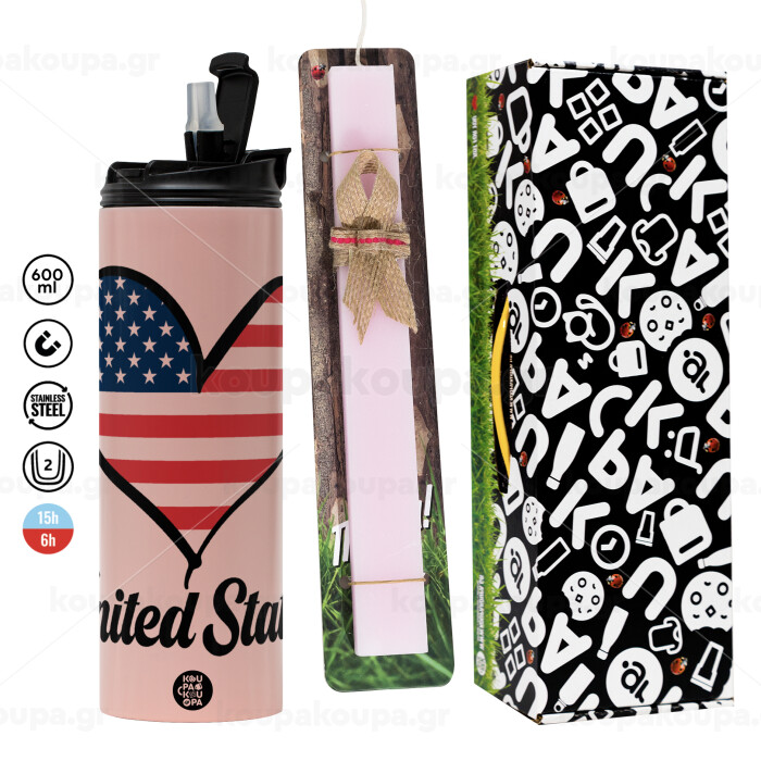 USA flag, Πασχαλινή Λαμπάδα με ΡΟΖ Travel Tumbler θερμό (600ml, BPA free) & κερί αρωματικό πλακέ (30cm) (ΡΟΖ)