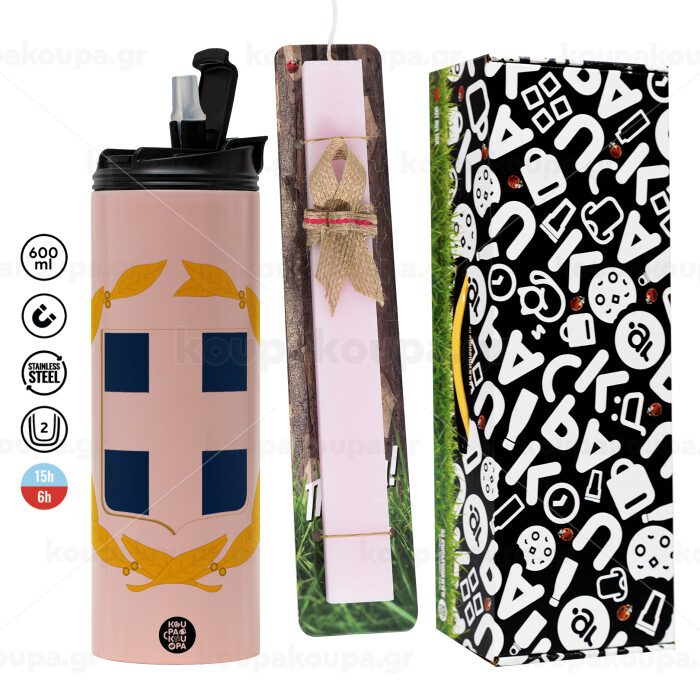 Hellas Εθνόσημο, Πασχαλινή Λαμπάδα με ΡΟΖ Travel Tumbler θερμό (600ml, BPA free) & κερί αρωματικό πλακέ (30cm) (ΡΟΖ)