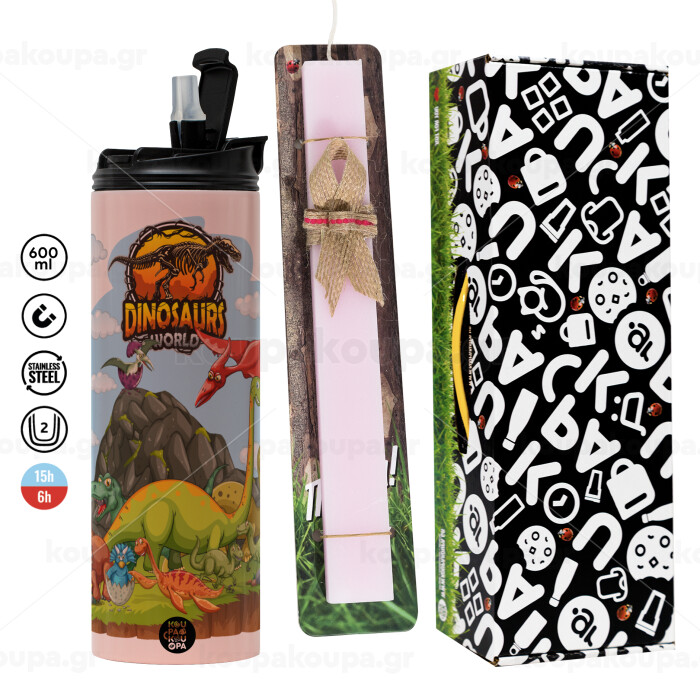 Dinosaur's world, Πασχαλινή Λαμπάδα με ΡΟΖ Travel Tumbler θερμό (600ml, BPA free) & κερί αρωματικό πλακέ (30cm) (ΡΟΖ)