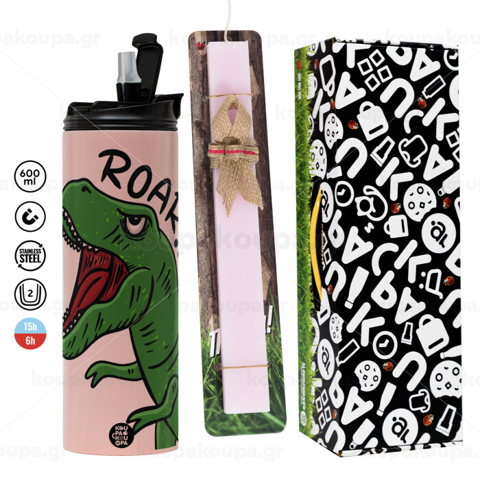 Dyno roar!!!, Πασχαλινή Λαμπάδα με ΡΟΖ Travel Tumbler θερμό (600ml, BPA free) & κερί αρωματικό πλακέ (30cm) (ΡΟΖ)