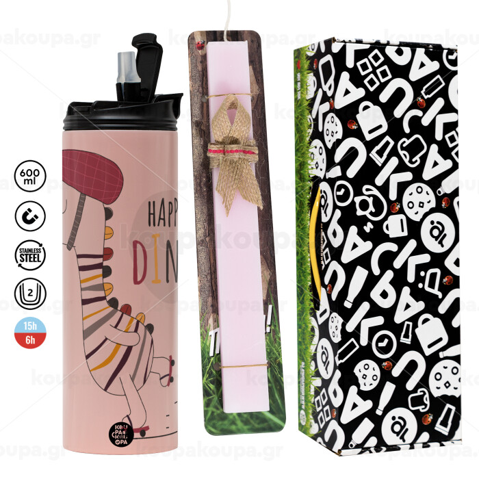 Happy Dino, Πασχαλινή Λαμπάδα με ΡΟΖ Travel Tumbler θερμό (600ml, BPA free) & κερί αρωματικό πλακέ (30cm) (ΡΟΖ)