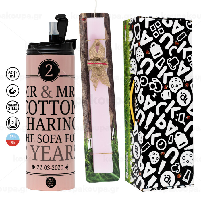 Mr & Mrs Sharing the sofa, Πασχαλινή Λαμπάδα με ΡΟΖ Travel Tumbler θερμό (600ml, BPA free) & κερί αρωματικό πλακέ (30cm) (ΡΟΖ)