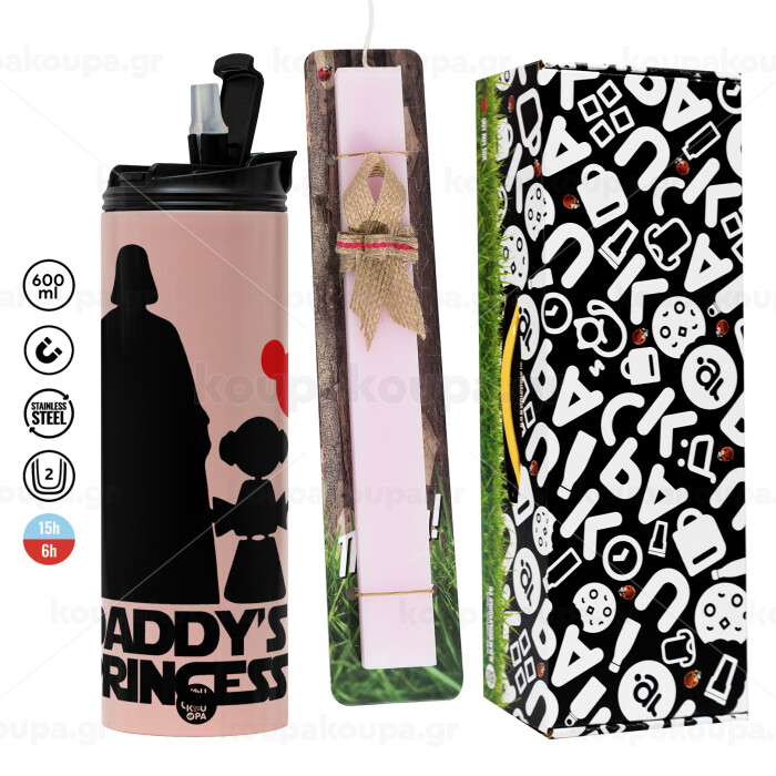 Daddy's princess, Πασχαλινή Λαμπάδα με ΡΟΖ Travel Tumbler θερμό (600ml, BPA free) & κερί αρωματικό πλακέ (30cm) (ΡΟΖ)