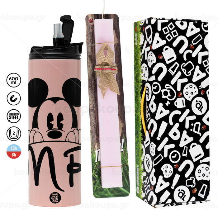 Mikey Mr, Πασχαλινή Λαμπάδα με ΡΟΖ Travel Tumbler θερμό (600ml, BPA free) & κερί αρωματικό πλακέ (30cm) (ΡΟΖ)