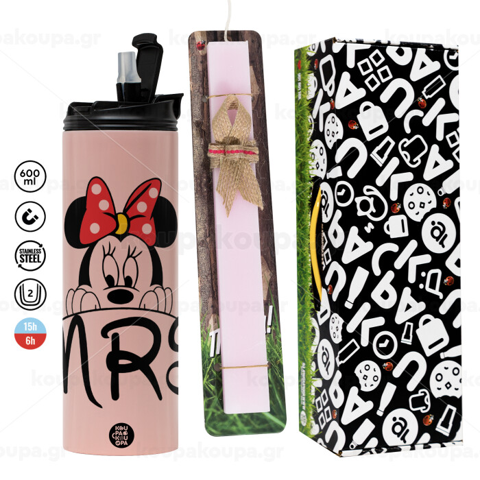 Minnie Mrs, Πασχαλινή Λαμπάδα με ΡΟΖ Travel Tumbler θερμό (600ml, BPA free) & κερί αρωματικό πλακέ (30cm) (ΡΟΖ)