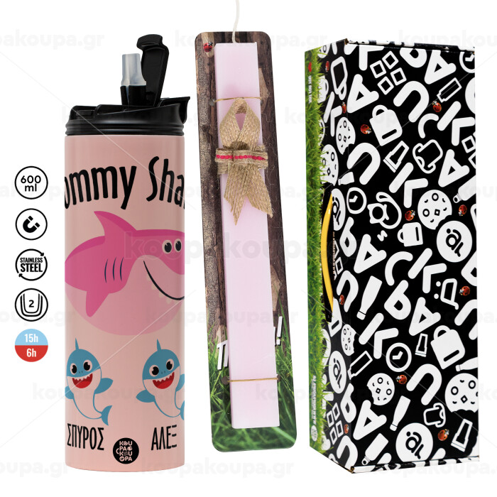 Mommy Shark (με ονόματα παιδικά), Πασχαλινή Λαμπάδα με ΡΟΖ Travel Tumbler θερμό (600ml, BPA free) & κερί αρωματικό πλακέ (30cm) (ΡΟΖ)